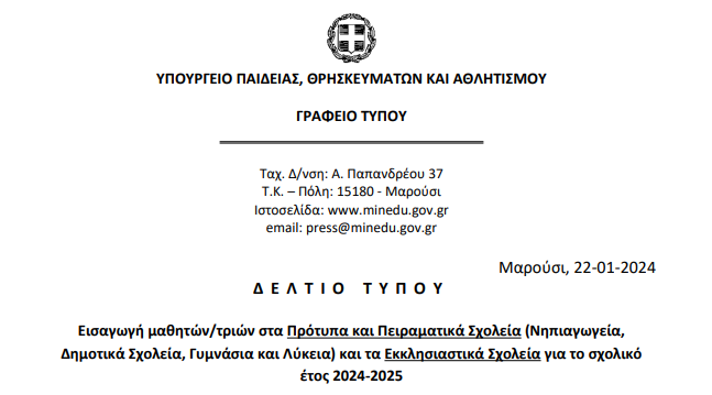 Το δελτίο τύπου του Γραφείου του Υπουργείου Παιδείας, Θρησκευμάτων και Αθλητισμού για την εισαγωγή των μαθητών/τριών σε Πρότυπα και Πειραματικά Σχολεία (Νηπιαγωγεία, Δημοτικά Σχολεία, Γυμνάσια και Λύκεια) και τα Εκκλησιαστικά Σχολεία για το σχολικό έτος 2024-2025 θα το βρείτε εδώ.