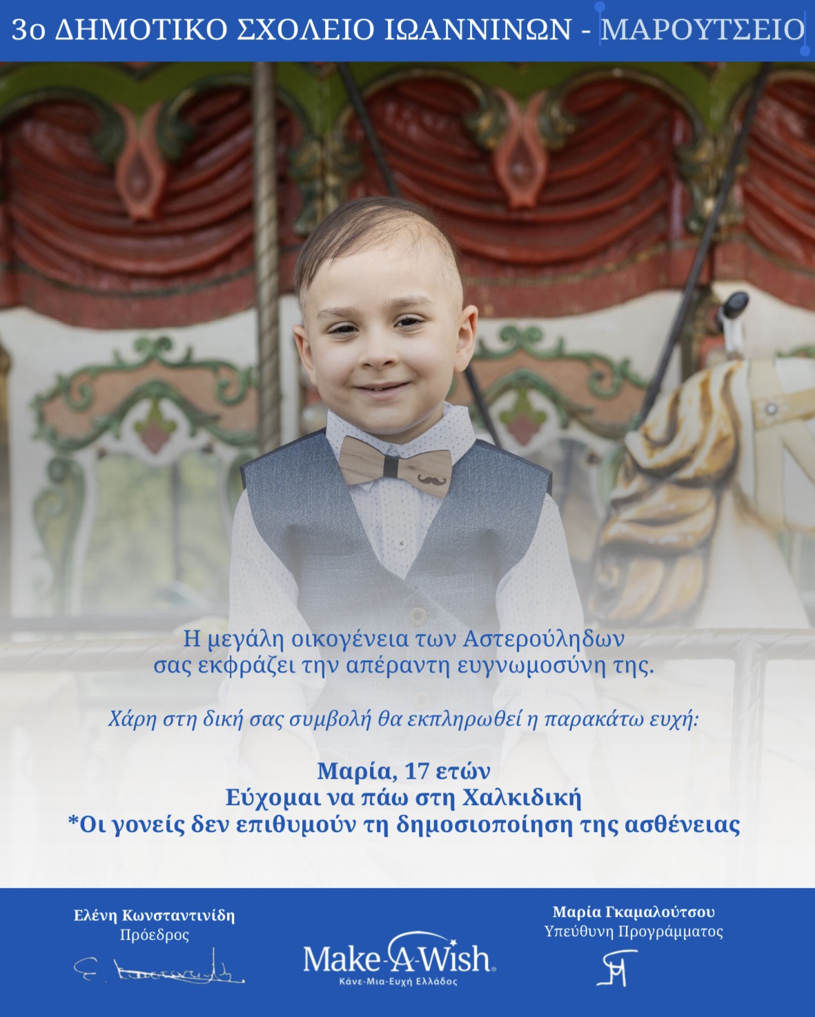 Για δεύτερη συνεχόμενη χρονιά το Σχολείο μας συμμετέχει στο προγραμμα «Make a wish». Με τη δωρεά το Σχολείο μας συμμετέχει, ώστε να εκπληρωθούν ευχές παιδιών που πάσχουν από σοβαρές για τη ζωή τους ασθένειες. Το πρόγραμμα Αστέρι της Ευχής, εδώ και 26 χρόνια, αποτελεί ένα από τα βασικά προγράμματα εξεύρεσης πόρων, ώστε να μπορούν να υλοποιηθούν ευχές παιδιών που έχουν στερηθεί την παιδική ανεμελιά.