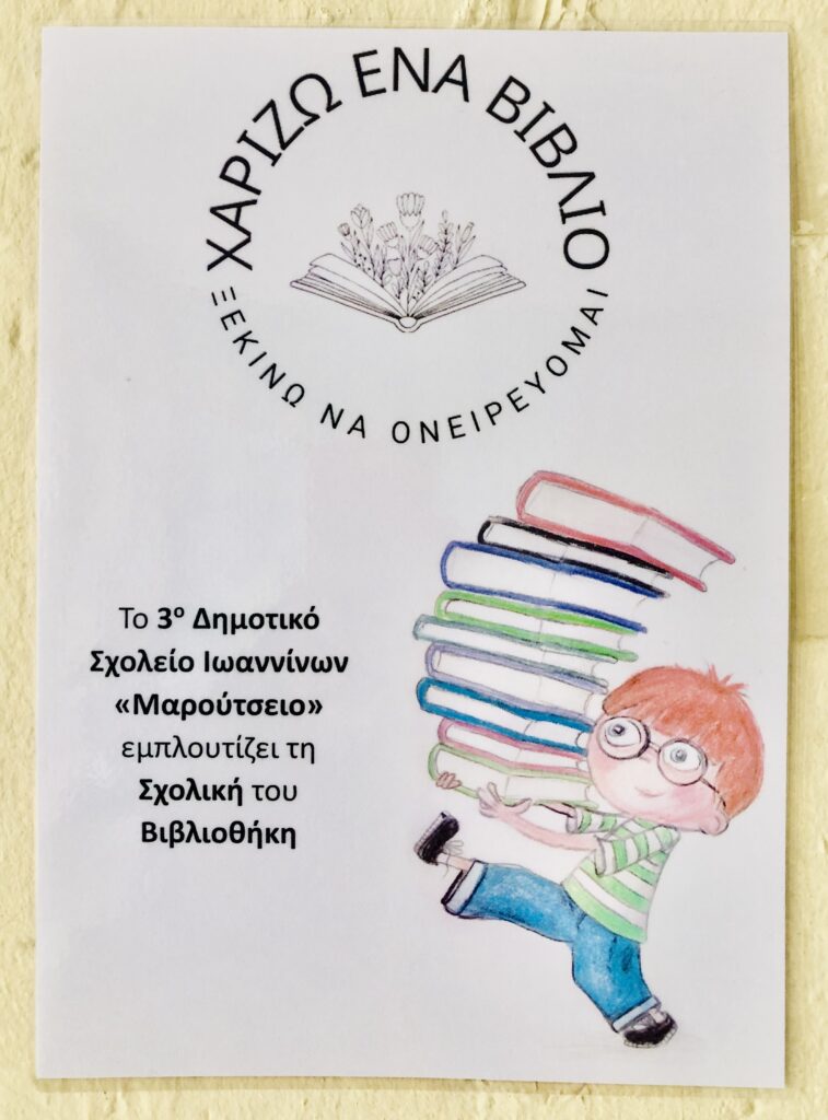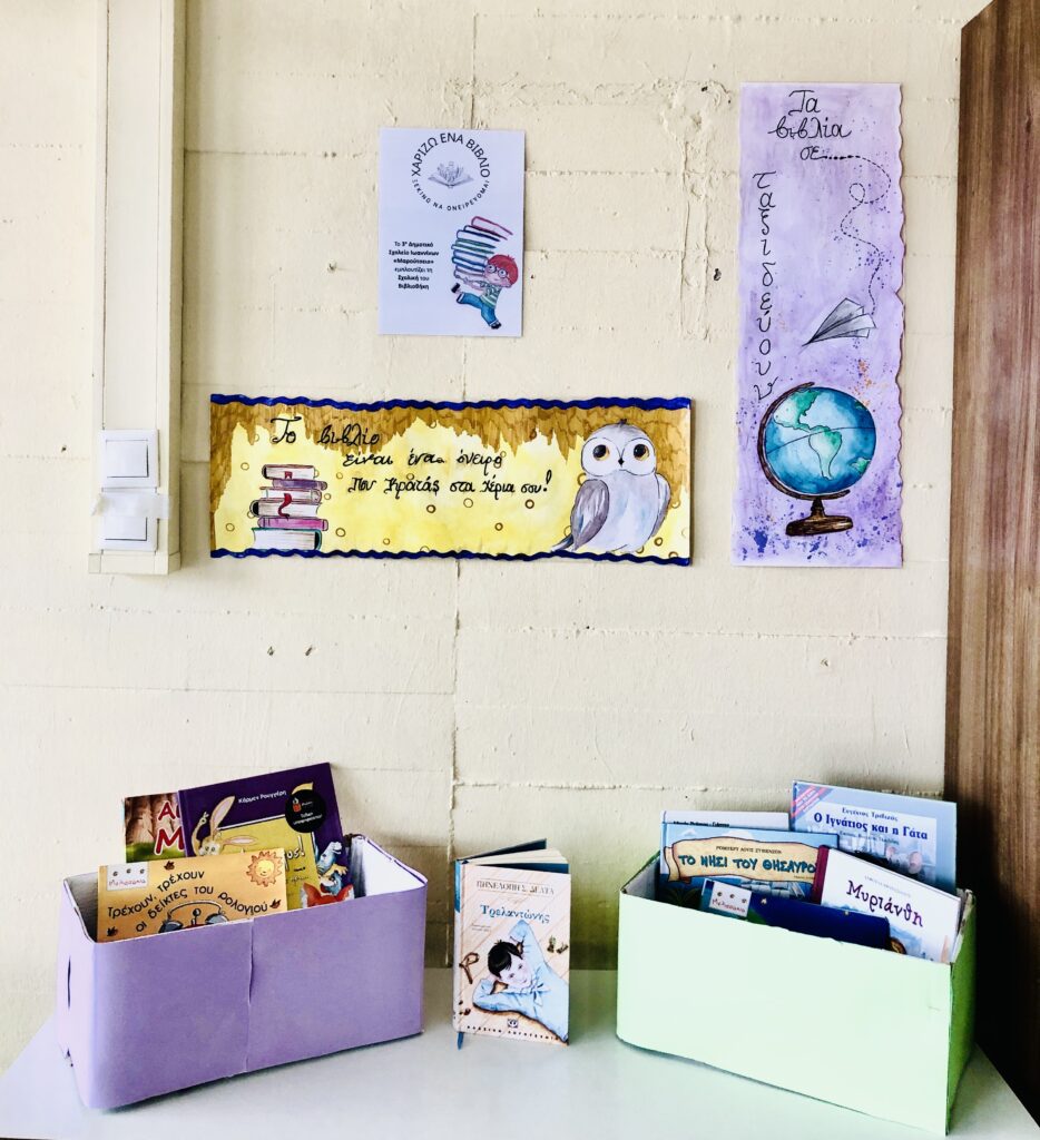 Από τον μήνα Φεβρουάριο η σχολική κοινότητα του Σχολείου μας δραστηριοποιείται στον εμπλουτισμό της Σχολικής μας Βιβλιοθήκης με τίτλο δράσης «Χαρίζω ένα βιβλίο, ξεκινώ να ονειρεύομαι». Στην είσοδο του Σχολείου, λοιπόν, διαμορφώθηκε ο χώρος για να φέρνουν οι μαθητές και οι μαθήτριες ένα από τα βιβλία τους που θα ήθελαν να χαρίσουν. Στη συνέχεια τα βιβλία καταγράφονται και τακτοποιούνται στη Σχολική μας Βιβλιοθήκη, την οποία με συγκεκριμένη συχνότητα θα επισκέπτονται όλοι οι μαθητές και όλες οι μαθήτριες του Σχολείου και θα δανείζονται βιβλία. Στόχος η καλλιέργεια φιλαναγνωσίας στην κοινότητά μας…