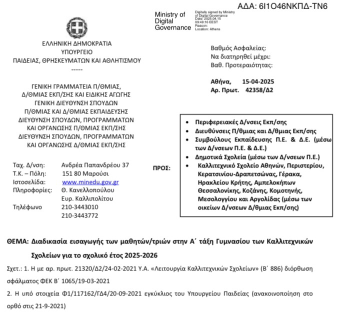 Screenshot Η διαδικασία βρίσκεται εδώ. Η εγκύκλιος βρίσκεται εδώ. Πλοήγηση άρθρων Ευχές Διαδικασία εισαγωγής των μαθητών/τριών στην Α΄ τάξη Γυμνασίου των Μουσικών Σχολείων για το σχ. έτος 2025-2026